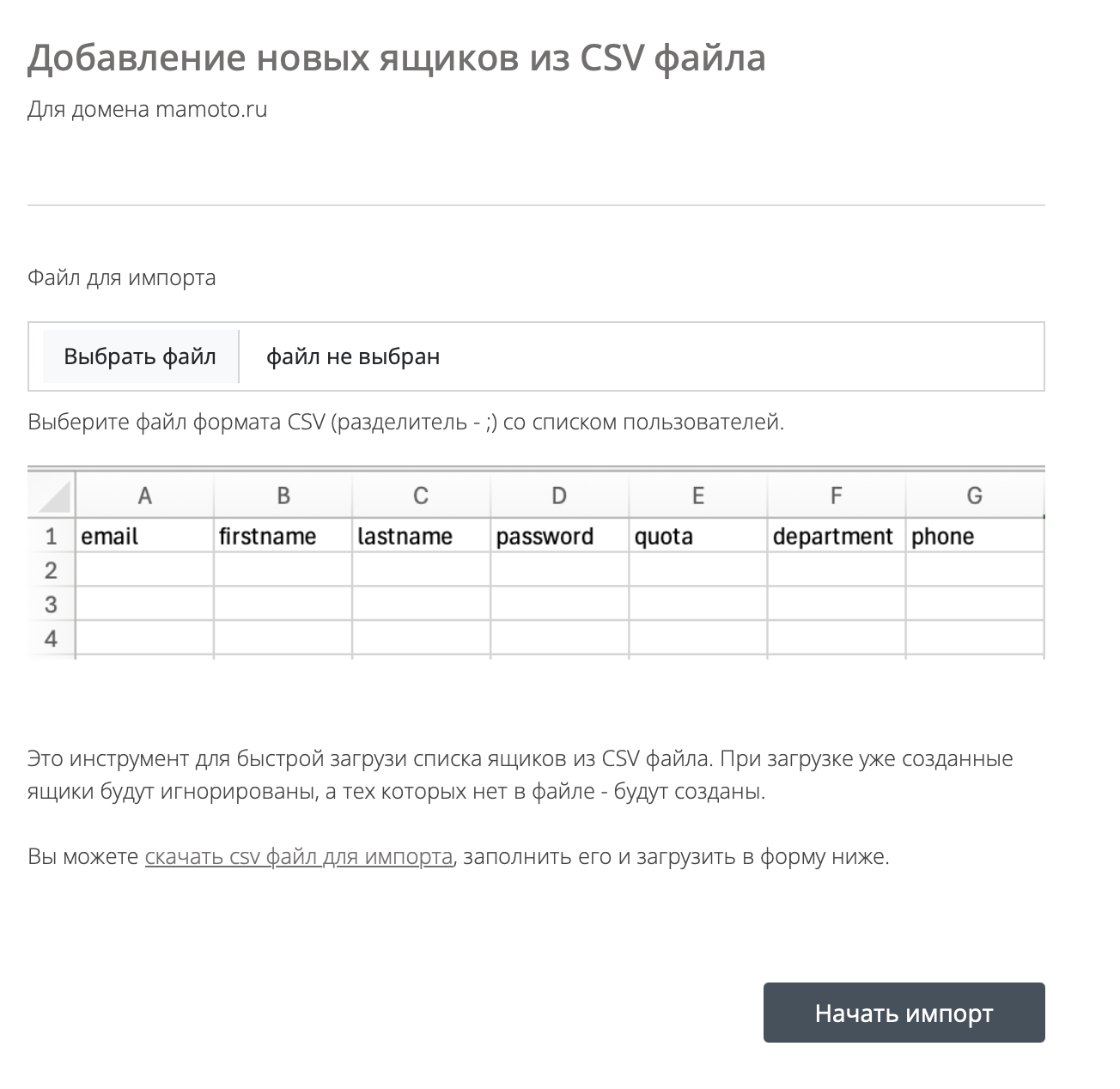 Это инструмент для быстрой загрузи списка ящиков из CSV файла. При загрузке уже созданные ящики будут игнорированы, а тех которых нет в файле - будут созданы.